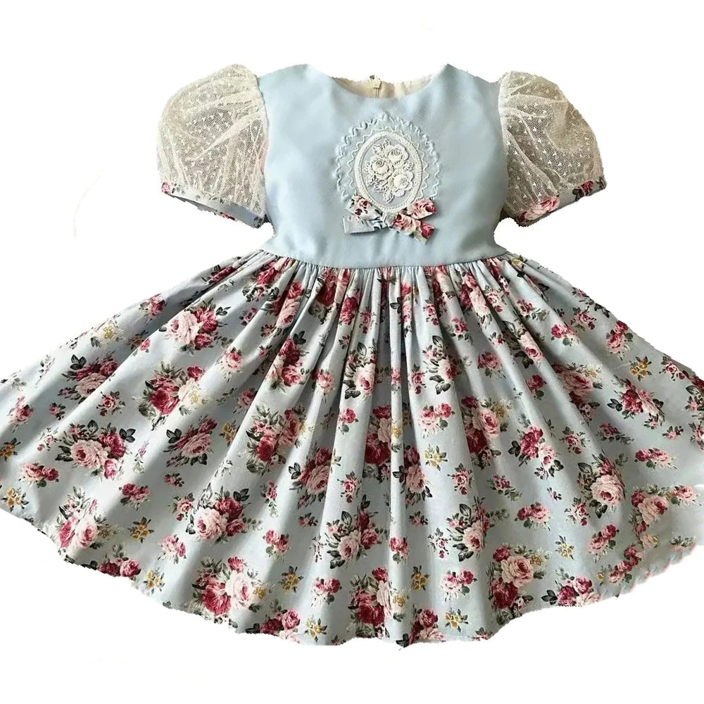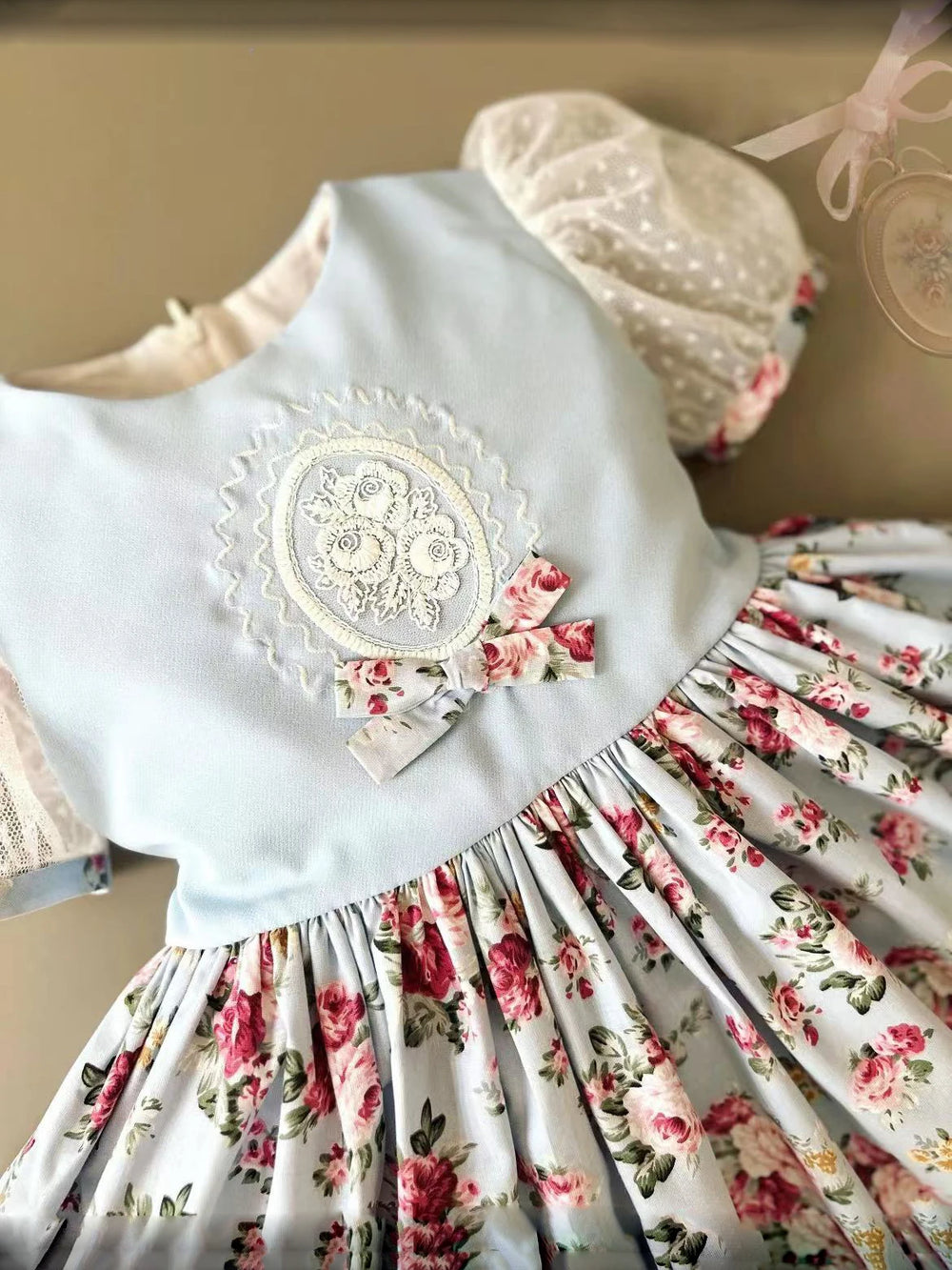 This exquisite dress is a masterpiece of design, blending the simple elegance of a solid-colored bodice with the vibrant joy of a floral skirt. The soft, powder-blue bodice provides a beautiful canvas for a delicate floral appliqué, while the romantic, sheer lace puff sleeves add a touch of vintage grace.